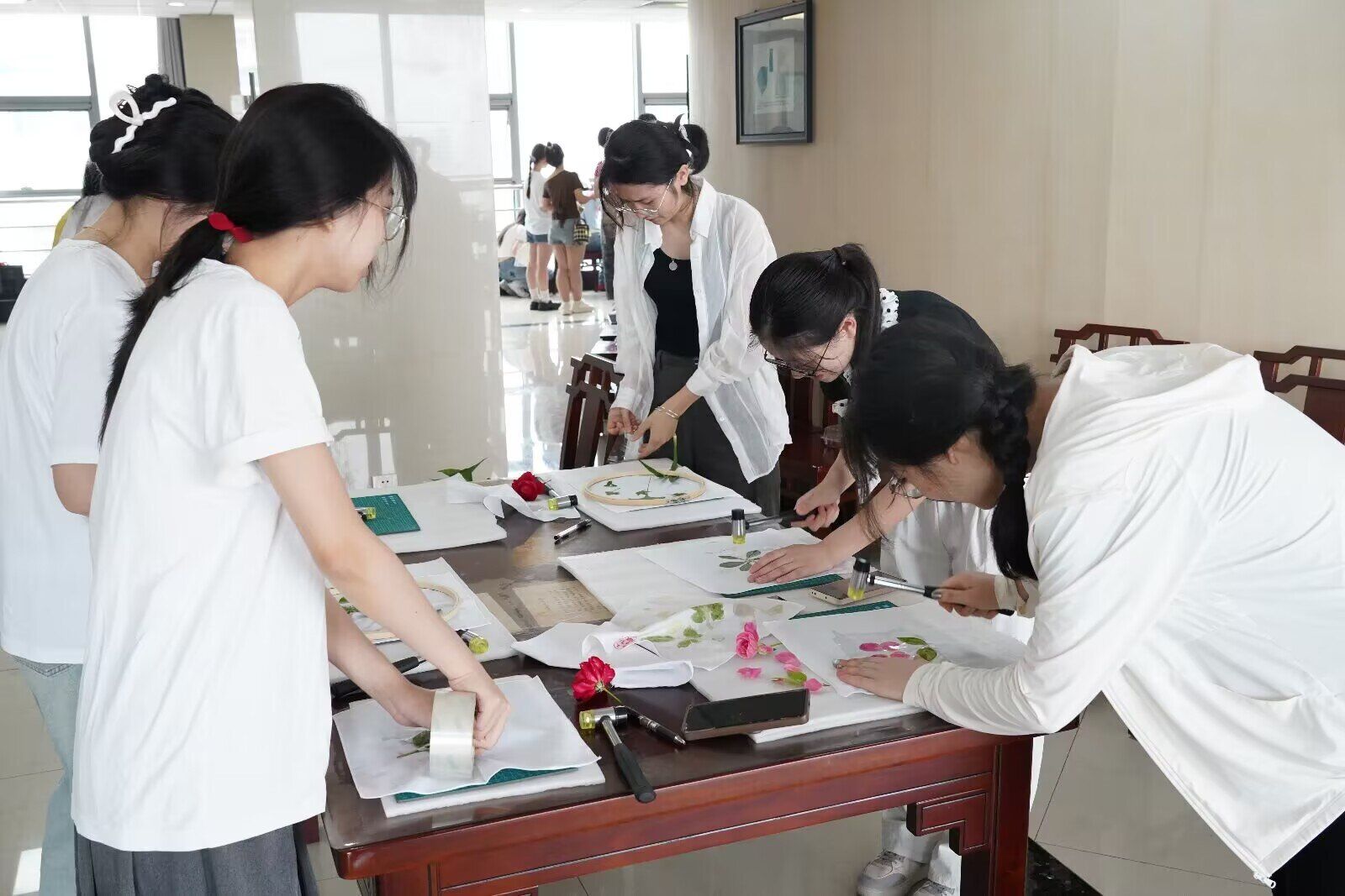 非遗体验环节,陈春玲通过实物演示方式,对雕版拓印、植物拓染以及漆扇绘制的制作技艺、文化变迁等内容进行精要讲解。随后,同学们便开展非遗体验活动:雕版前凝神滚墨、覆纸施压,拓染区巧手铺陈枝叶,漆扇台执笔挥毫。一时间,古老技艺在师生默契协作下焕发新生。
