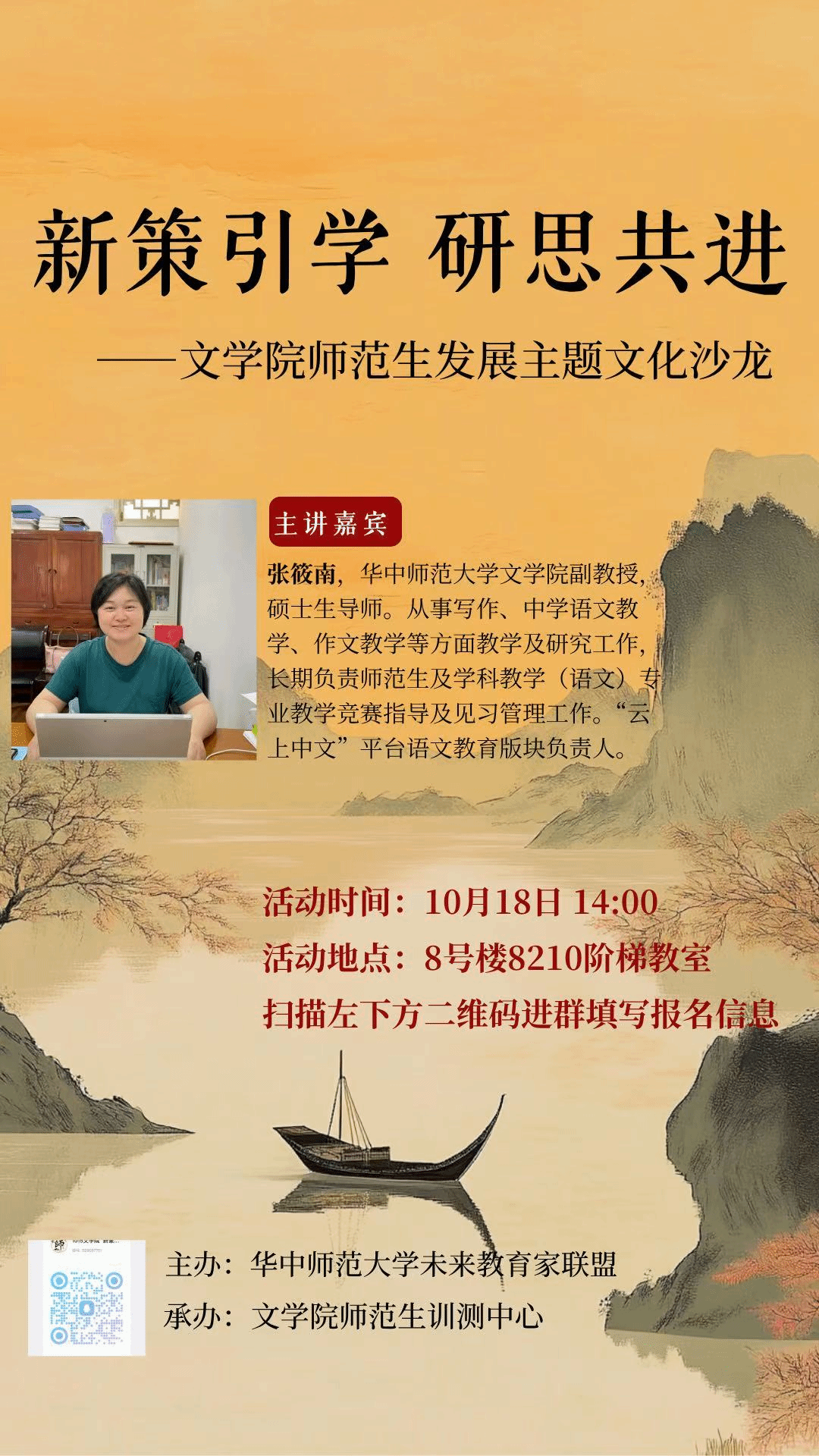 文学院讯(通讯员 杨玉玲 何阳雅颂 万可伊)为引导文学院师范生明确学习方向、提升科研素养、增强职业竞争力,2025年10月18日下午,“新策引学,研思共进”文学院师范生发展主题文化沙龙于8210阶梯教室成功举行。本次活动由华中师范大学未来教育家联盟主办,文学院师范生训测中心承办。