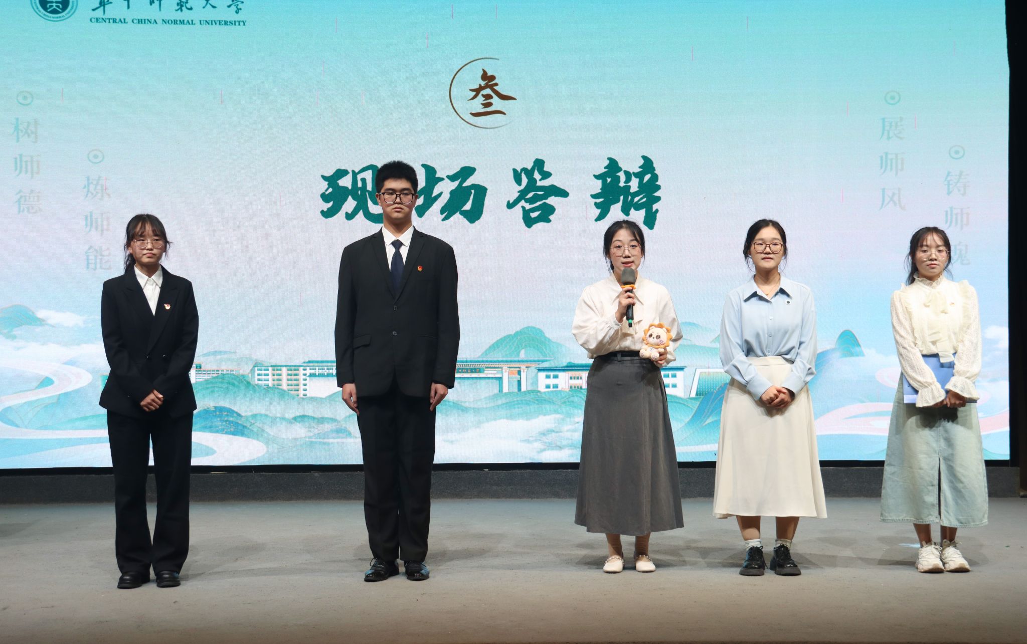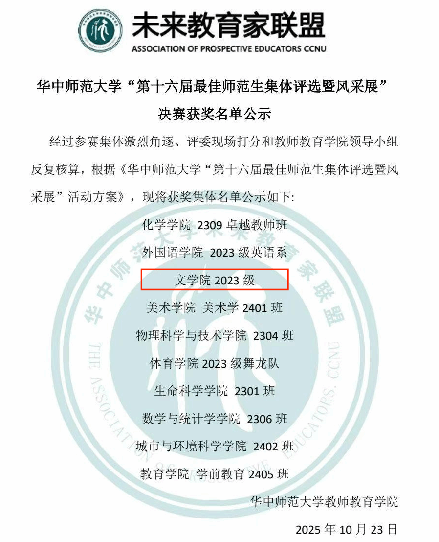 文学院讯(通讯员 王铭浩)10月22日,由华中师范大学教师教育学院主办、未来教育家联盟承办的“第十六届最佳师范生集体评选暨风采展”决赛在九号楼演播厅举行。来自全校各学院共15个师范生集体围绕“树师德、炼师能、展师风、铸师魂”的主题进行集体风采展示和现场答辩,受到湖北日报等媒体的报导。文学院2023级代表我院参赛,以排名前三的总分获得“第十六届最佳师范生集体”荣誉称号,充分展现了文学院师范生集体的风采与实力。