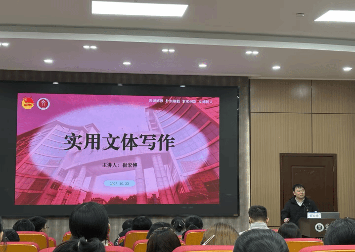 文学院讯(通讯员 李喆 宋永博)10月22日下午,文学院2025年“青马工程”暨团干培训实用文体写作培训课程在文学院一楼报告厅开展。本次培训聚焦于提升团学骨干写作能力,由文学院团委组织部学生骨干郭可儿主持,团委书记崔宏博主讲,新一届团学骨干全体参与培训。