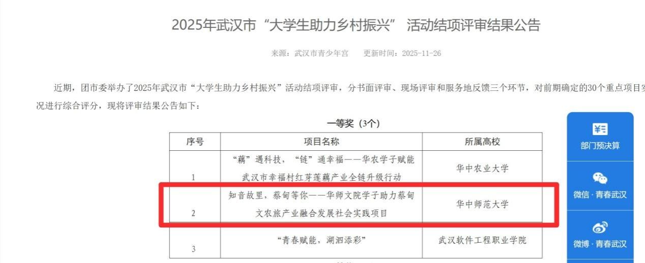 文学院讯(通讯员 喻莉津 高兰溪)近日,在2025年武汉市“大学生助力乡村振兴”重点项目结项评审中,华中师范大学文学院“逐梦知音”实践团队凭借《知音故里,蔡甸等你——华师文院学子助力蔡甸文农旅产业融合发展社会实践项目》荣获一等奖(全市仅三个)。该项目依托华中师范大学中国语言文学一流学科与拔尖人才培养基地班的综合优势,以文学赋能为核心,生动展现了新时代青年在乡村振兴中的使命与担当。此前,该项目已获评2025年武汉市青年志愿服务竞赛银奖。