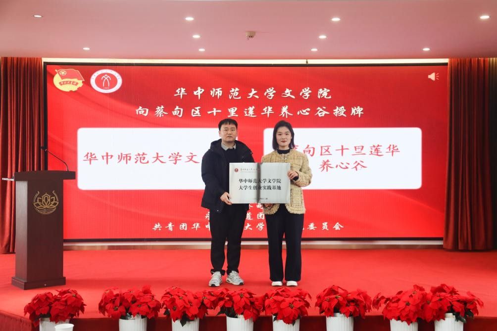 随后,华中师范大学文学院、十里莲华养心谷共同为“大学生创业实践基地”授牌,并向邓永勤颁发了华中师范大学文学院创业导师聘书,助力青年学子提升创业实战能力。