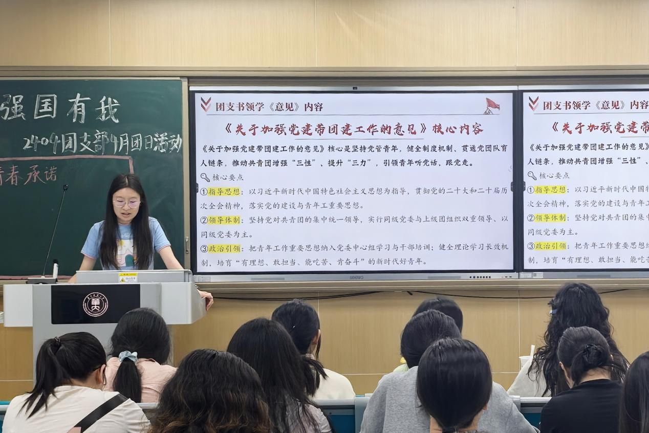 活动开始,团支书谭惠之带领全体团员深入学习《关于加强党建带团建工作的意见》。她从多个角度解读文件,强调共青团要增强政治性、先进性、群众性,提升引领力、组织力、服务力。团员们认真聆听,深刻认识到“党建带团建”对青年成长的重要性,也坚定了自觉听党话、跟党走的信念,立志成长为“有理想、敢担当、能吃苦、肯奋斗”的新时代好青年。