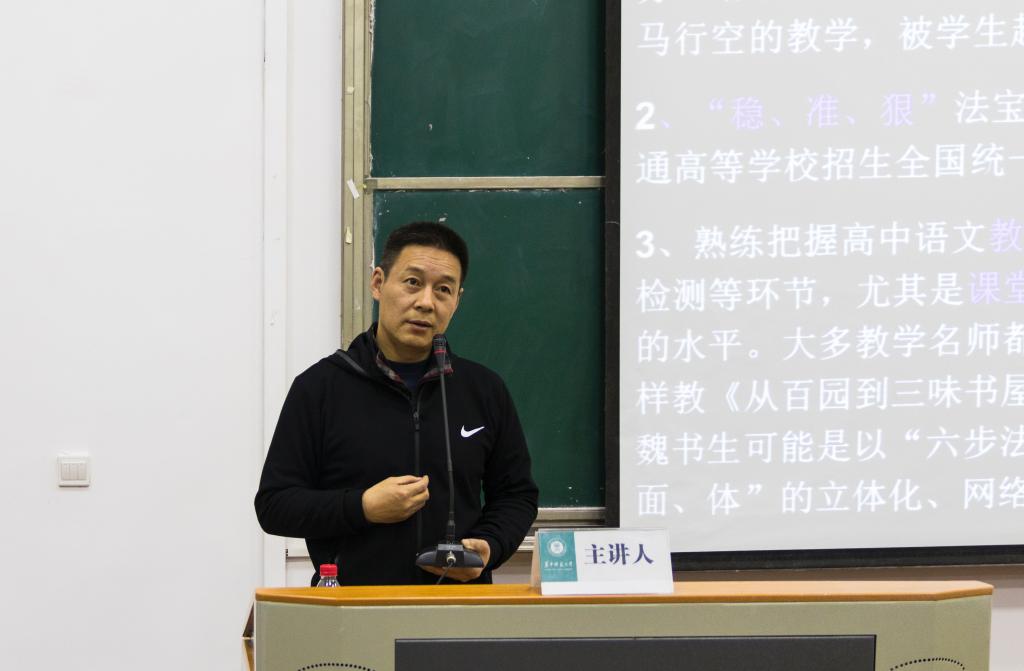 (通讯员:陈新月 白雪洁)3月23日晚,由华中师范大学文学院主办,文学院团委学生会学术科研部、文学院团委学生会师范生训测会承办的第二期“师说”在文学院2201课室开展。武汉大学附属中学高中语文教研组长黄旭午担任此次活动主讲人,黄旭午老师以“如何成为研究型的语文老师”为主题,向同学们讲授语文教学经验。