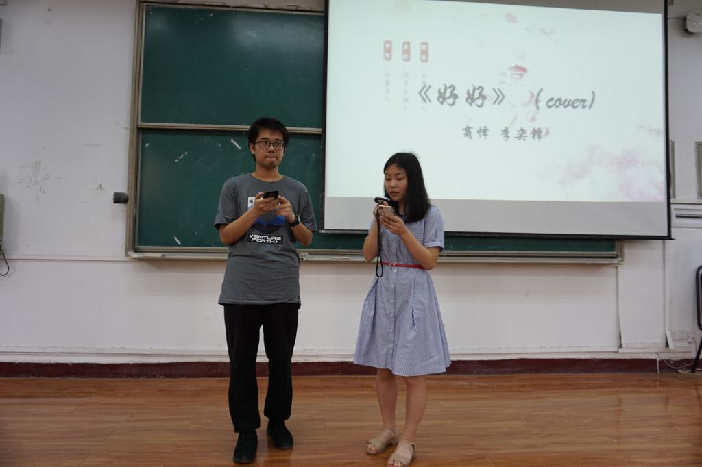 然后是五班的特色班级文化展示。团支书冯凌云首先为大家介绍了班导师和班级委员,并展示了五班班歌,冯凌云希望大家都能如歌词“我还在你身旁,你还在我身旁”所说,携手共进,团结一心。随后是班级成员的才艺展示,郭小南一首《水边的阿狄丽娜》钢琴solo,明快自然。商怿和李奕峰合唱《好好》,尽显甜美清新。最后是羿美君和杨先艳同学的汉服秀,以一支舞蹈《桃源恋歌》和一曲《锦鲤抄》,展现出汉服的柔美婉约。五班同学的表演,让五班文化获得了全体同学的认同和赞扬。