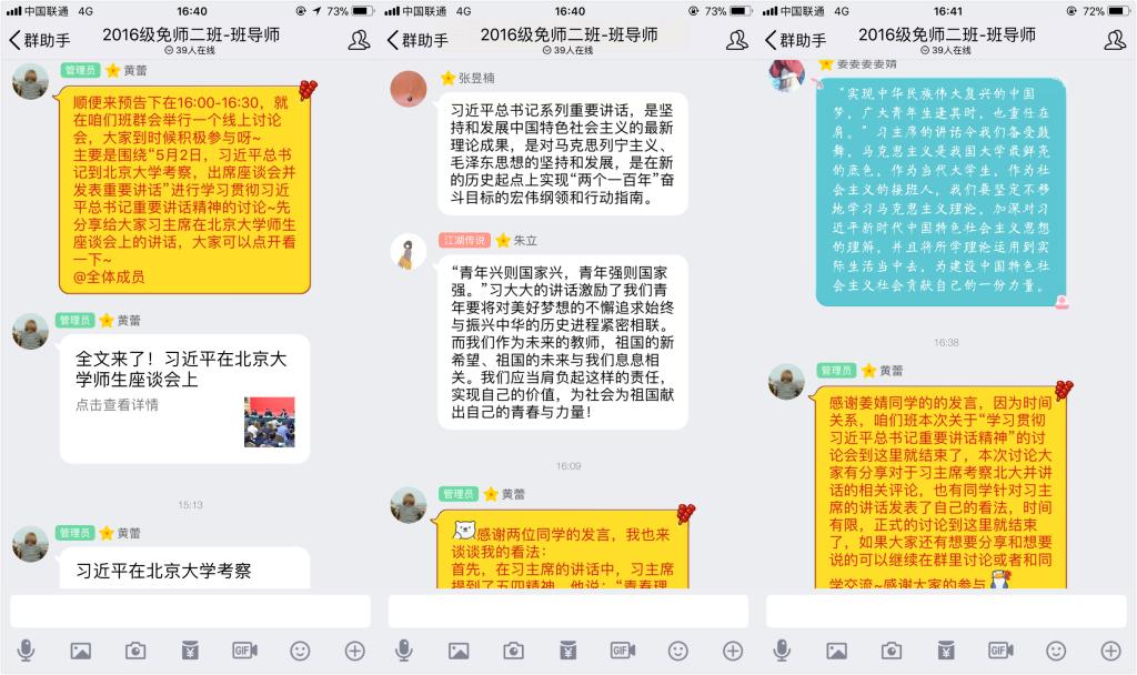 下午四点,讨论会正式开始,免师二班张昱楠同学率先发言,在阅读过习主席在北京大学师生座谈会上的讲话后,她分享了自己的感受:“习近平总书记系列重要讲话,是坚持和发展中国特色社会主义的最新理论成果,是对马克思列宁主义、毛泽东思想的坚持和发展,是在新的历史起点上实现“两个一百年”奋斗目标的宏伟纲领和行动指南。”,随后朱立同学也分享了自己的感受,她指出习主席的讲话激励了我们青年一代,同时朱立同学联系作为未来教师的师范生指出:“我们作为未来的教师,祖国的新希望、祖国的未来与我们息息相关。我们应当肩负起这样的责任,实现自己的价值,为社会为祖国献出自己的青春与力量”。