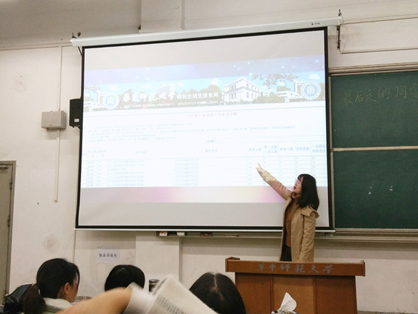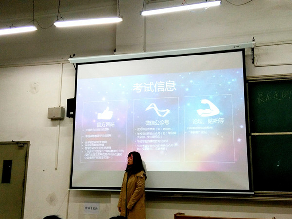 随后,周琦学姐简要介绍了我院2014级的考研情况。她以“50/150的考研成功率”信息导入,进一步为同学们详细地分享了文学类考研的相关报考院校及专业等相关信息。