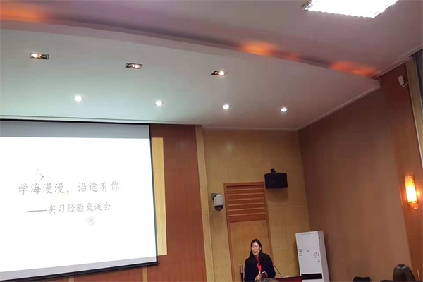 活动伊始,郝琴老师上台致辞,对五位实习归来的同学表示热烈的欢迎。接着,郝琴老师给同学们介绍了近几年来专硕的就业形势,勉励同学们要树立好明确、清晰的目标,多积累、多实践,充分利用学校、学院提供的各种资源,夯实基础,砥砺前行,时刻谨记“机会是留给有准备的人的”。郝老师的发言引发台下热烈的掌声。