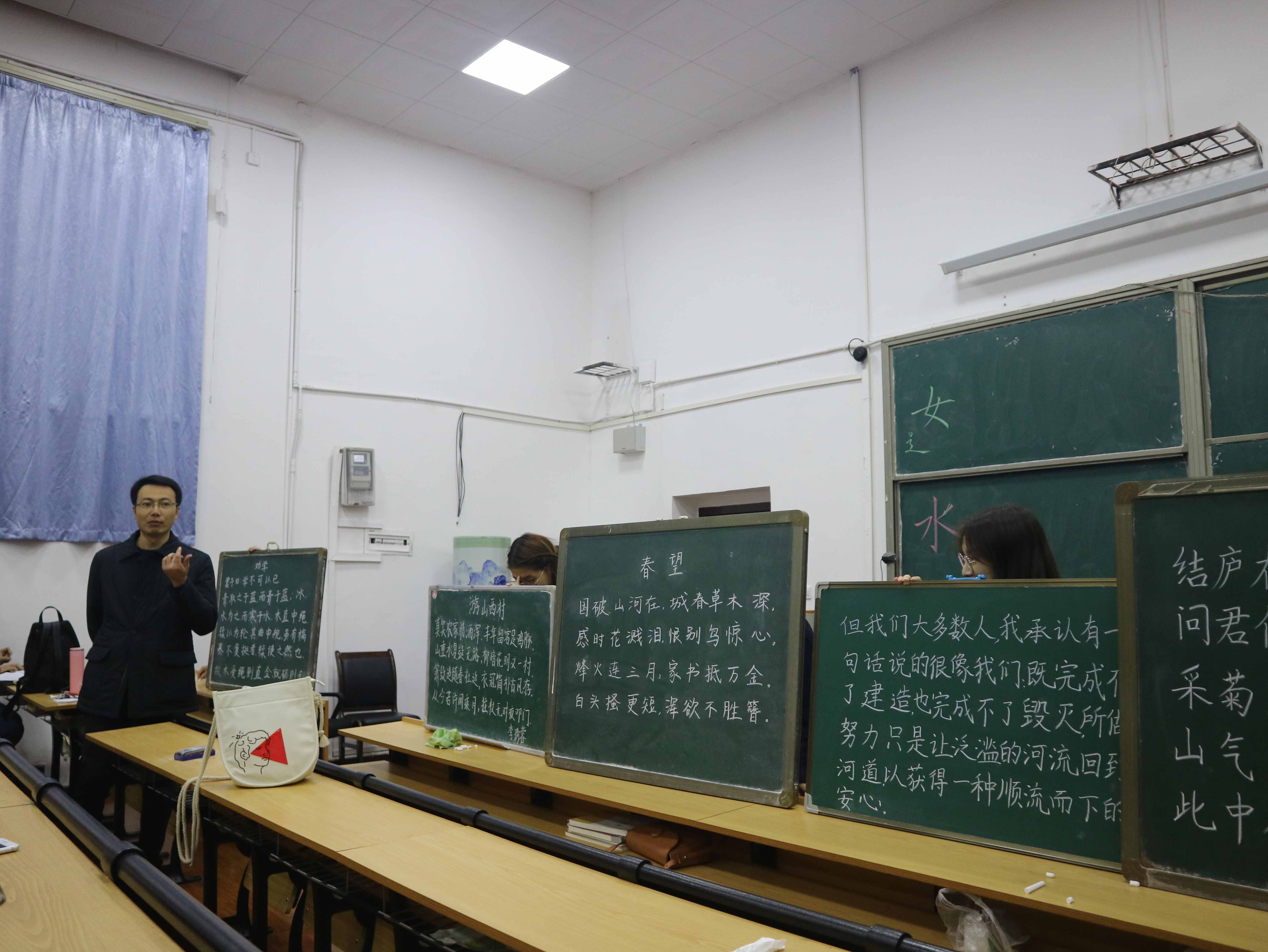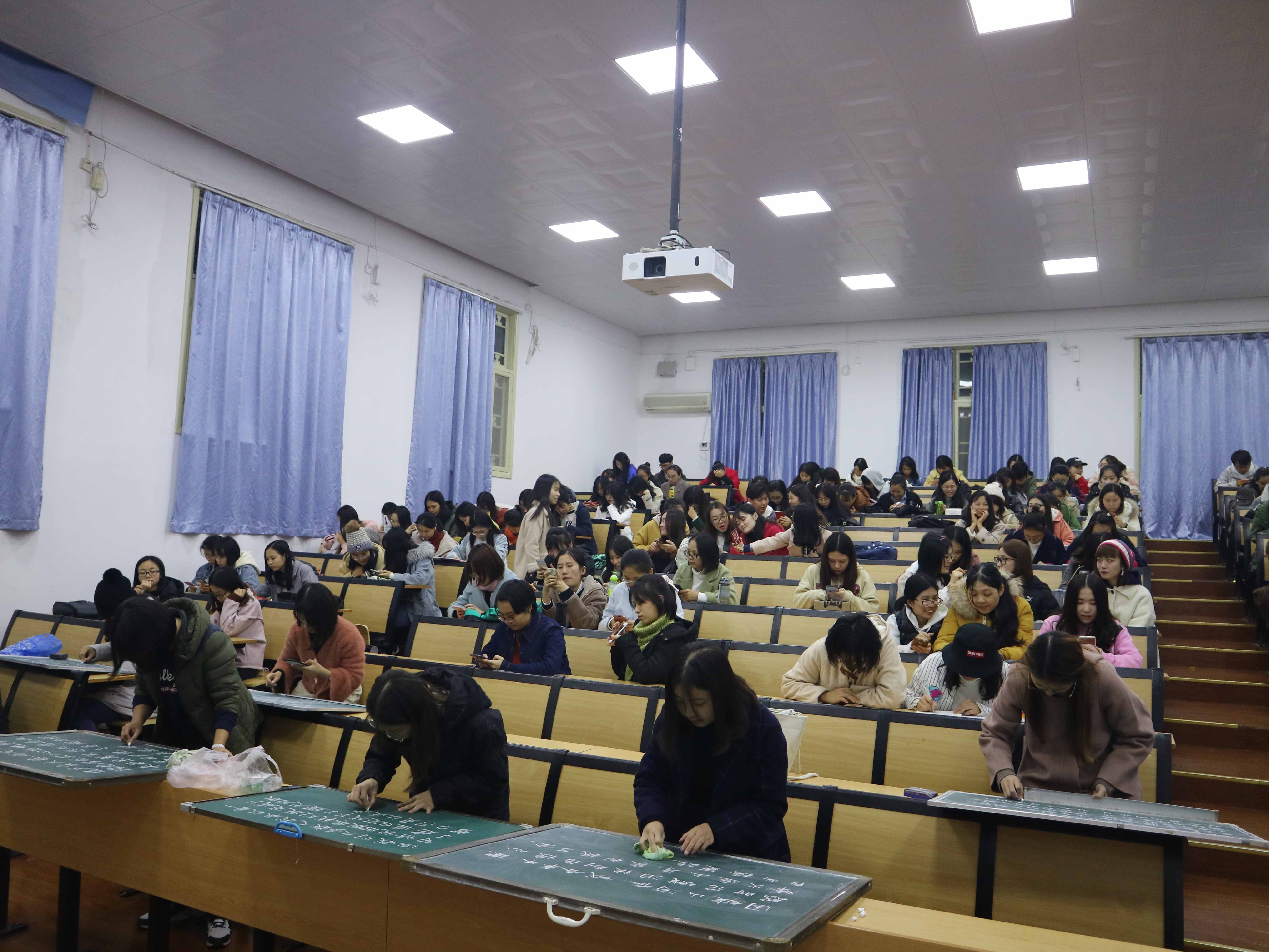 其中“日训练”是在学习小组的安排下,要求每位同学每周上交两份作品,其中每份作品字数要求控制在60字左右;“周评比”是指小组同学上交作品后通过投票等方式最终挑选出优秀作品在微信公众平台“馨语轩”上进行推送展示;在最终的“月总结”中,每组会推选1-2名代表,进行最终现场比拼,并邀请老师进行指导。本次粉笔字书写指导活动就是一次“月总结”。