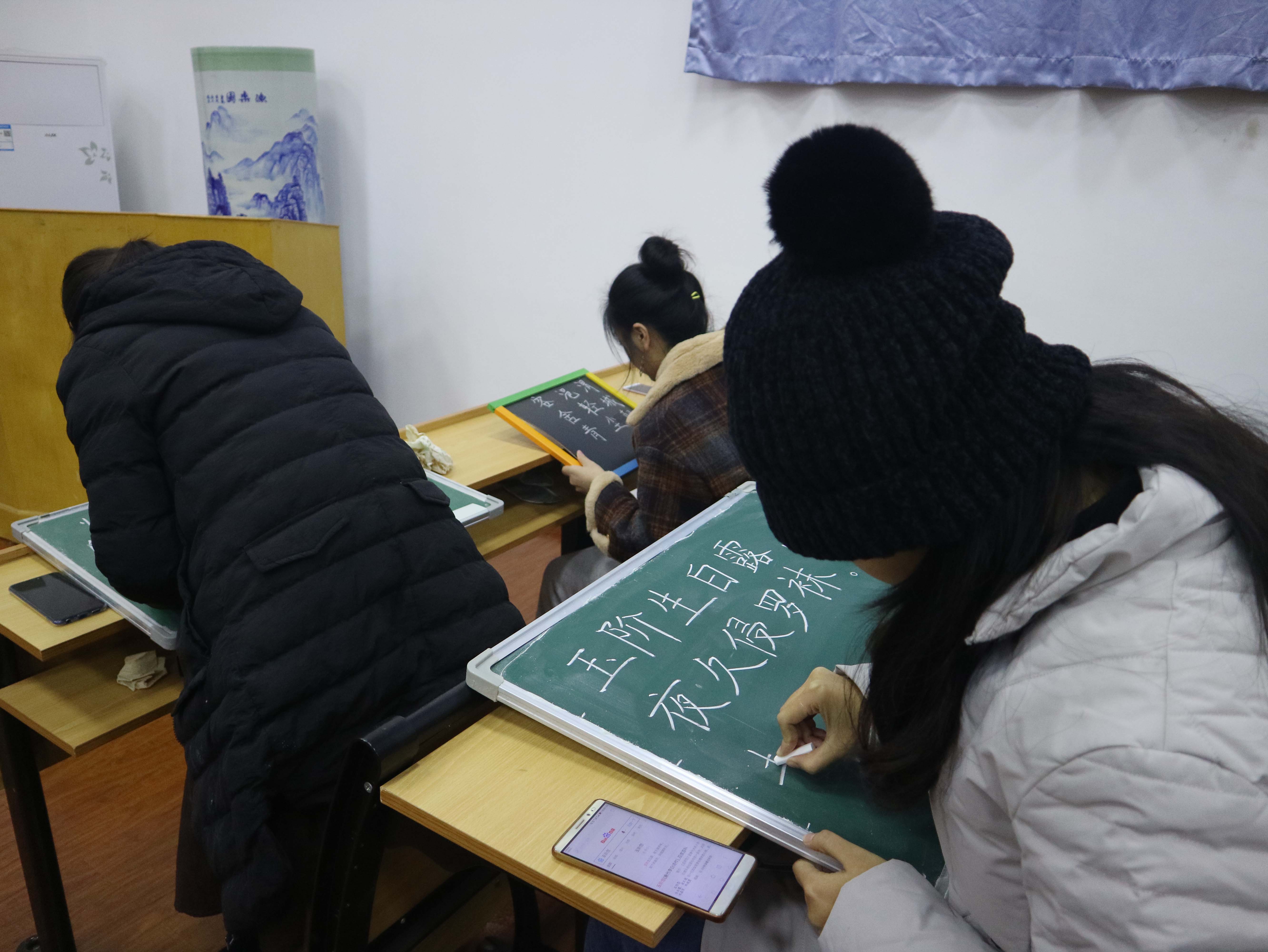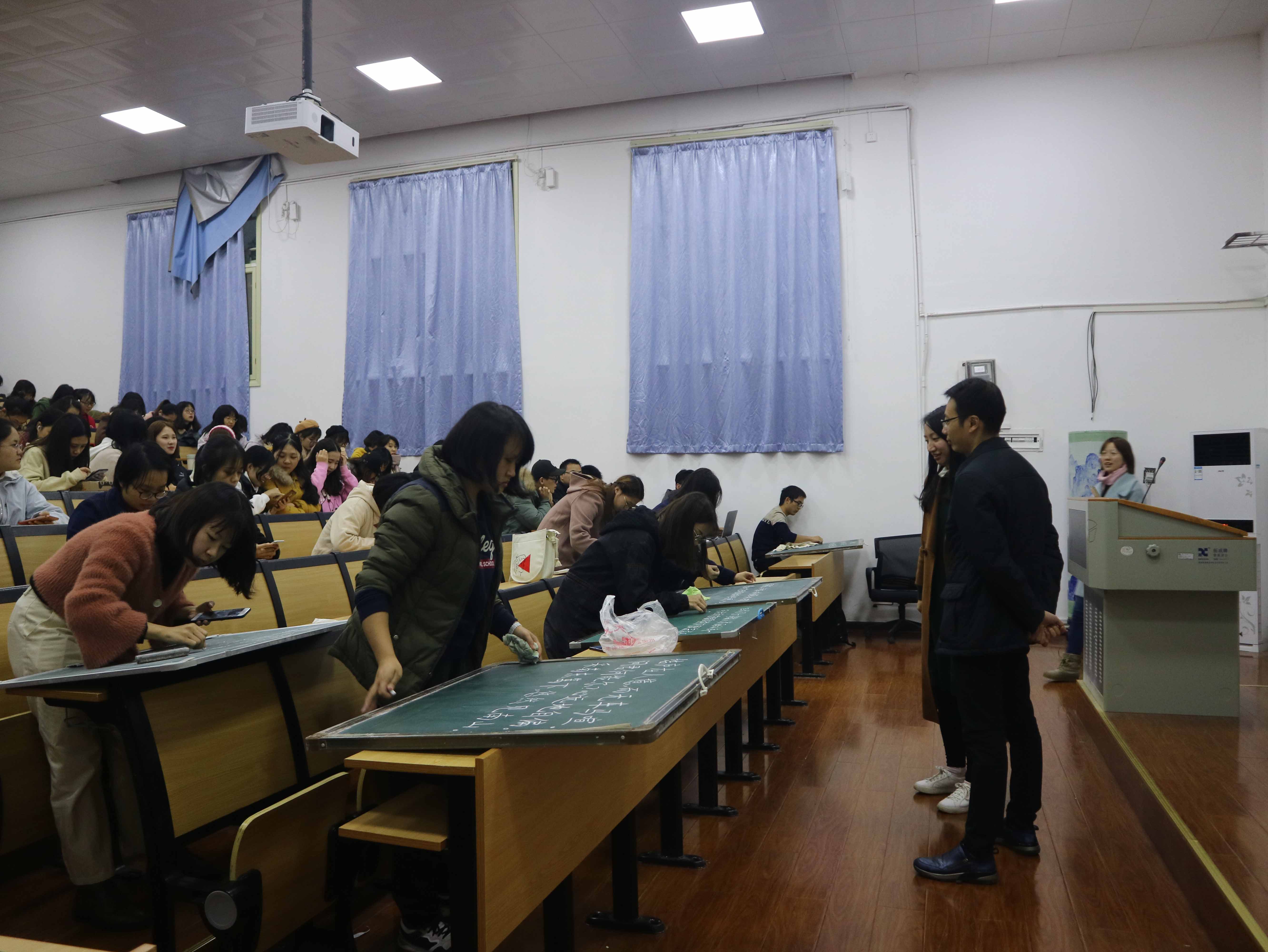 (通讯员:黄蕾 符雨莹)2018年11月18日晚五点半,在文学院2016级公费师范生的晚点名现场,九位同学通过推选的方式参与到本次年级的粉笔字书写指导活动中。作为粉笔字书写活动的指导老师,毛德胜老师也来到现场观看了九位同学的书写过程,对他们的板书进行了点评和指导。