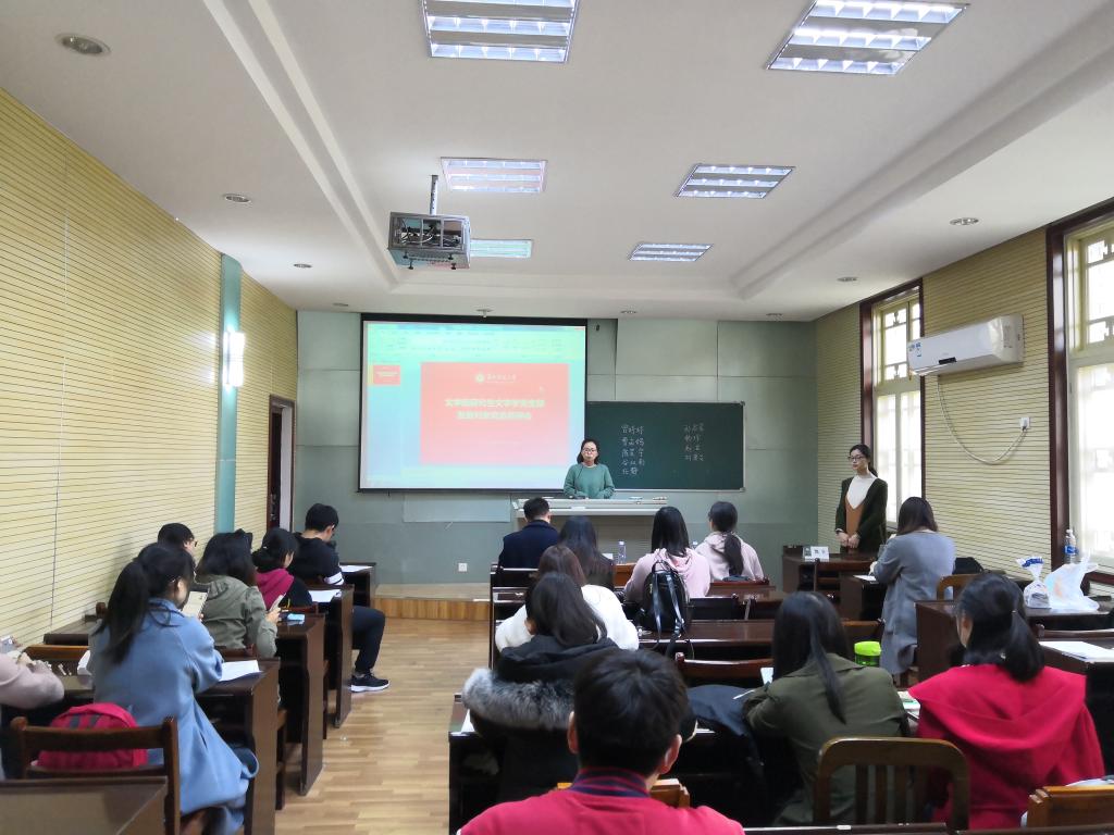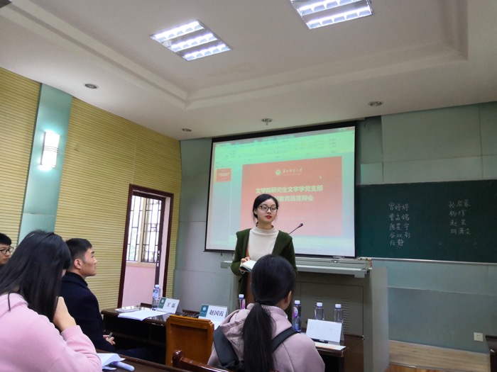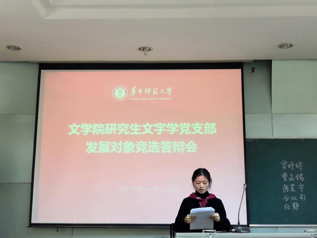 (通讯员:徐洪达)2018年11月29日中午,研究生文字学党支部2018——2019学年第一学期发展对象竞选答辩会在文学院三楼学术报告厅顺利举行。文字学支部上届书记欧阳小璐,文学院研究生各支部书记王磊、赵国霞、郭争等四人出席并担任答辩会评委,大会由文字学支部书记申文雅主持。