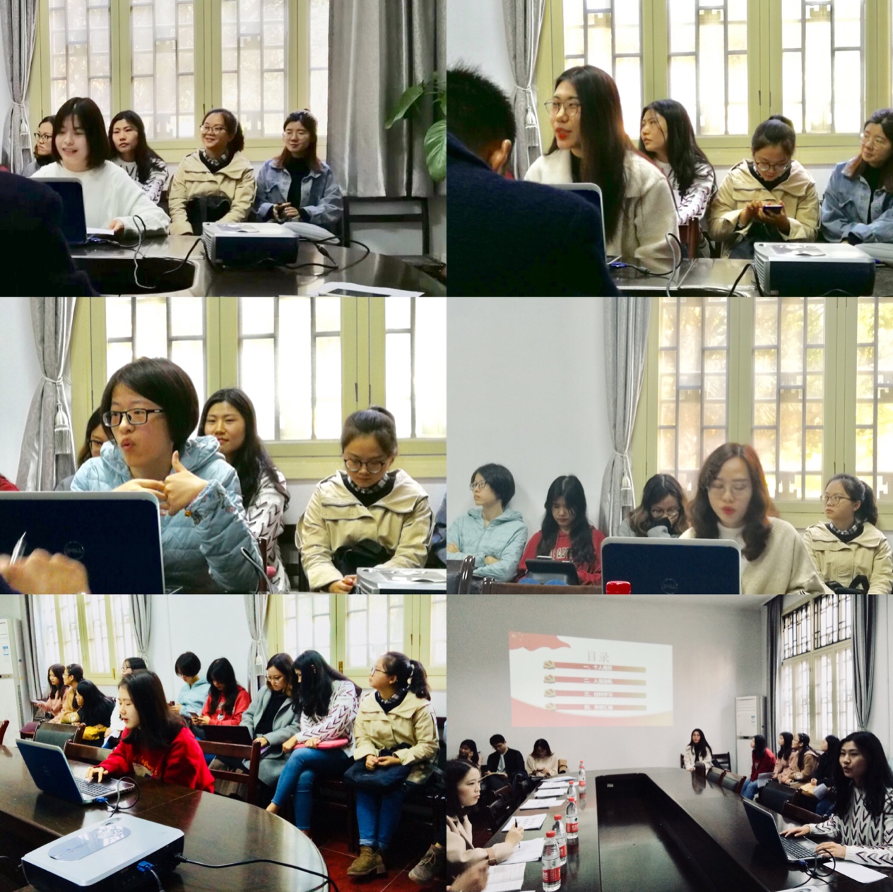 (通讯员:彭玲)2018年11月29日中午12点,文学院比较文学与世界文学师生联合党支部2019年度发展对象推选答辩会在比较文学与世界文学教研室召开。大会由比较文学与世界文学师生联合党支部组织委员王磊主持,在职教职工党员、学生党员(含预备党员)共计11人参加了大会,符合大会召开要求。语言学及应用语言学党支部书记郭争、汉语言文字学党支部书记申文雅、中国现当代文学党支部书记赵国霞、汉语国际教育支部书记尹天姿作为入党顾问团出席本次会议。本次发展对象推选答辩会的计票人为支部宣传委员彭颖,监票人为支部组织委员彭玲。