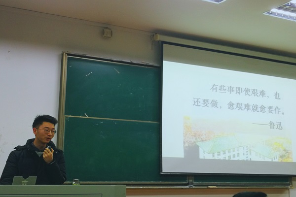 讲座伊始,徐子昭以幽默的标题“铁打的颜值,打铁的现实”引入,首先介绍了汉语言文学专业的课程和发展方向,其中他重点介绍了古代文学方面的专业选修课,并展示出了一系列的阅读书目,重点说明了阅读的重要性。随后,他讲解了有关于推免和考研的条件及时间安排。对于推免,他指出应该注重硬件和软件两个方面的提高,从当下做起,脚踏实地地努力;而对于考研,他列出了一个时间安排表,指出要合理安排时间及复习计划,并着重强调了坚持的可贵。最后,他以鲁迅先生的一句话作结,“有些事即使艰难,也还要做,愈艰难就愈要做”,激励同学们把握当下,迎难而上。