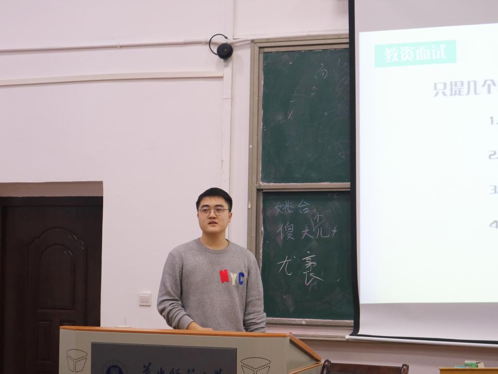 首先,秦天学长就从自己的实际情况出发,简单谈及了在教师资格证面试中要注意的几点,学长谈到“有准备就无所畏惧,不紧张是第一要义,能轻松可起死回生,成教师须有亲和力。”学长就用这简单的四句话点出了面试之前和之中我们需要关注的要点。学长的实习经历比较特别,他前往美国堪萨斯州大学进行海外研修。秦天学长分享了自己在这个过程的成长和体验,认为这样的机会能够结识到更多优秀的人,也能在很大程度上拓宽自己的视野,更能直观感受到中国教育和西方教育的差别,进而发现和学到新的知识。接着学长和我们分享了自己的“求职就业录”和就业面试过程中通常会遇到的几个环节,提醒我们在平时进行相关讲课训练的同时,也应该锻炼自己的应变、表达和思辨能力。秦天学长强调我们在进行择业的时候要考虑周全,因为就业是一个很现实的问题,建议我们在自主择业就业的时候要考虑到相关的城市、薪资、未来等方面的问题。