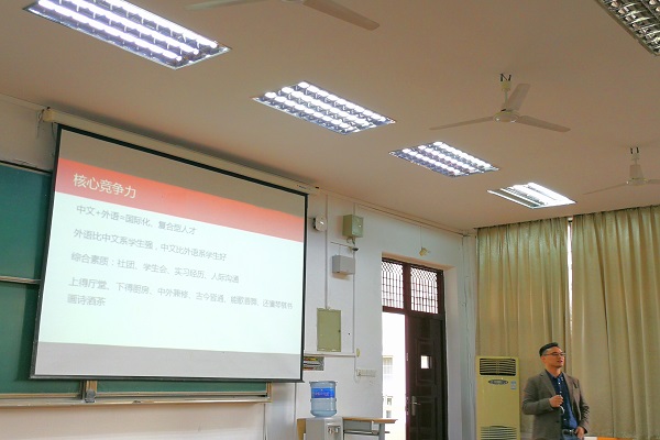 然后他从概括到具体、由浅入深地介绍了该专业的人才培养与未来就业方向。学习该专业会拥有多方面的核心竞争力,首先是复合型人才,即中文加外语同步培养;第二是较高的综合素质,熟悉中外文化,多样丰富的交流项目以及跨文化交际能力等;第三是开阔的国际视野,即通过教学进行文化交流与传播。随后他以往届优秀毕业生为例,并结合就业数据统计表格说明该专业的就业率与就业前景是非常好的,就业方向主要集中在进行汉语国际教育的高校或教育机构、进行教育教学工作的各类学校、从事涉外工作的各类政府部门或企事业单位以及从事文秘、编辑、翻译等的机构和单位这四类。