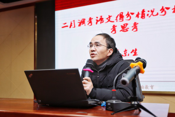 活动伊始,武昌区教研员吴东生老师通过相关数据表格精细化地分析了武昌区二月调考语文考试情况,从命题因素、教师教学状况、学生答题技巧等多个角度总结了武昌区高中语文二月调考反映出来的具体问题并针对高三二轮复习指明方向、提出建议。在报告中,他强调教师要全面理解“以考促学”。从政策方向、问题方向、目标方向几个角度把握复习备考,
