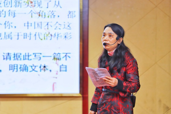 全国优秀语文教师、湖北省特级教师王德先老师随后上台发言。他结合自身多年的阅卷经验,解释了高考语文主观题阅卷中的“采意”给分。同时,他鼓励教师们多参加高考阅卷,这不仅有利于教师把握高考考情,对教师的个人发展也多有裨益。他还指出在作文教学中应当注重个别指导,针对不同的学生提出不同的建议,帮助学生突破自己的薄弱点。同时要把读写结合起来,注重在阅读教学中挖掘出写作的方法和素材,让学生真正爱阅读、爱写作。只有这样,作文教学才会更有效率。