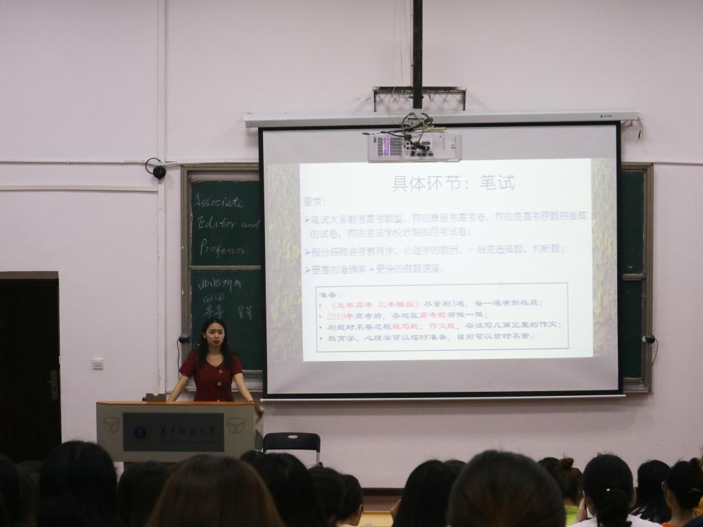 (通讯员:强珍 符雨莹)2019年5月12日下午5:30,15级公费师范生钟婷学姐在文学院2201教室针对高中学段的就业准备相关事项作了分享,16级全体师范生参与了此次分享会。