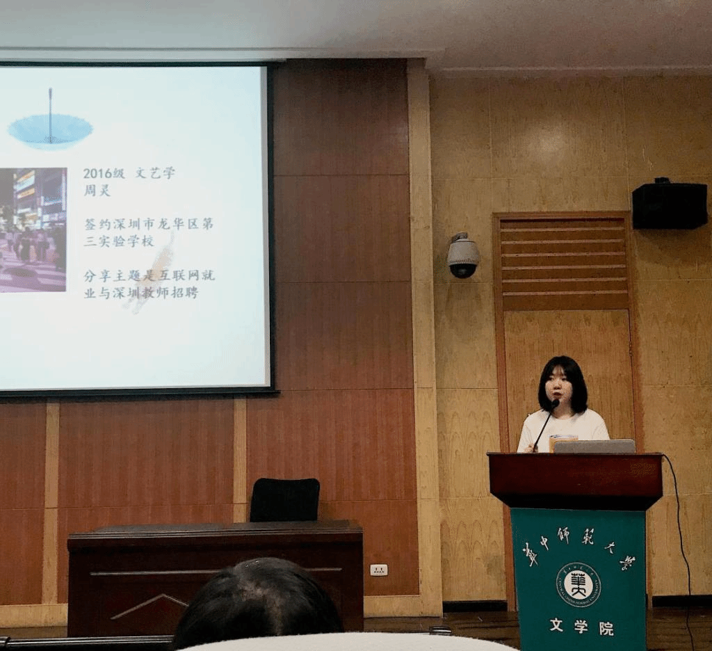 文艺学专业的周灵学姐在签约之前做了许多尝试,她拥有丰富的互联网实习经历,最终考虑各方因素后,选择签约深圳市龙华区第三实验学校。她戏称自己是教师应聘中的“野路子”,向各位同学讲述了其从互联网到教师的择业转变过程和其“非典型深圳教师应聘经历”。周灵学姐细致分析对比了互联网与教师二者的职业前景、职业素养和对个人生活方式的影响。她指出互联网行业拥有较为宽松自由的工作环境,且有利于培养大家的持续学习能力。但面临当今的“互联网寒冬”,应届毕业生与涉行一、两年的新手的确有不小的失业风险。