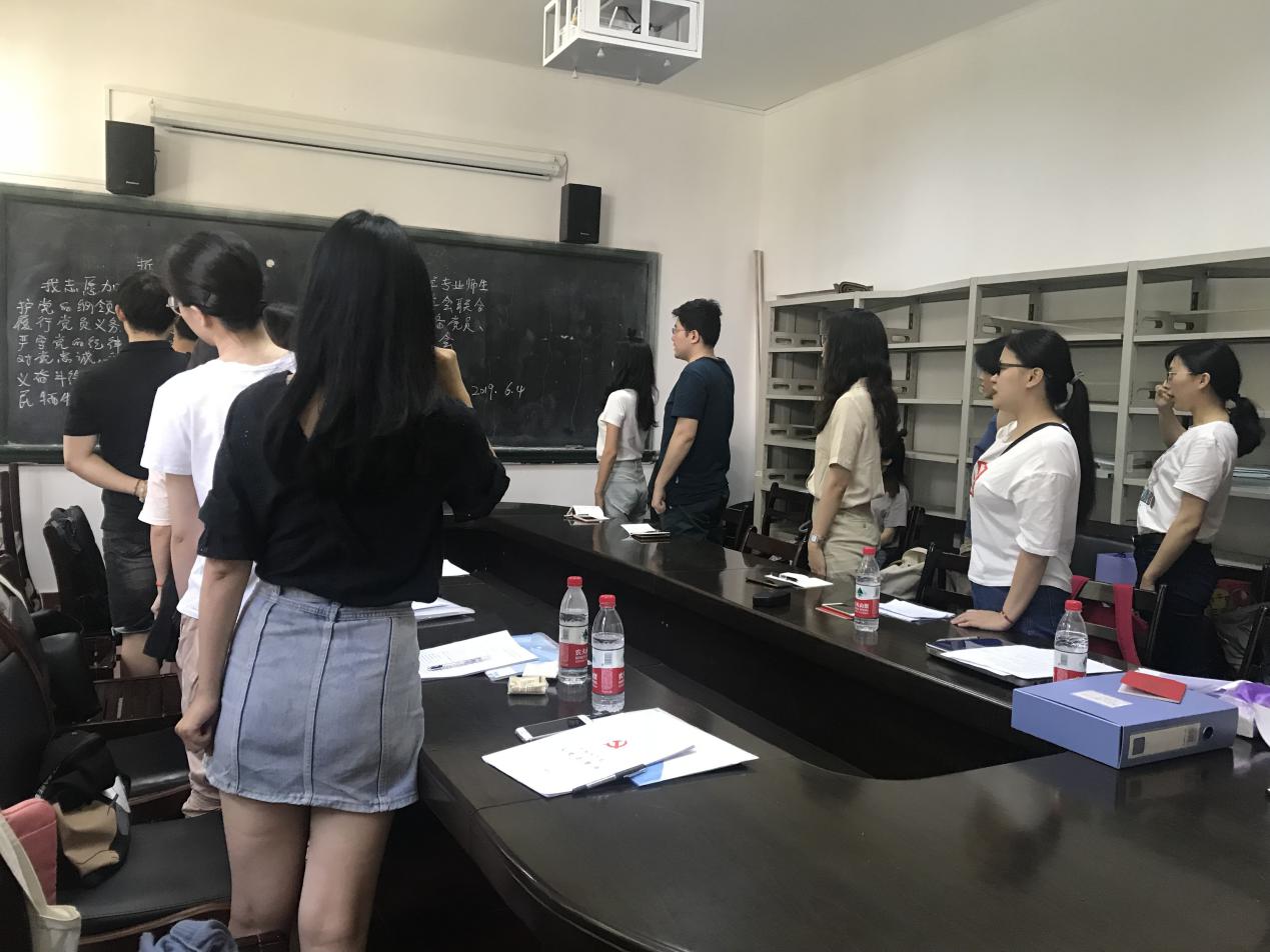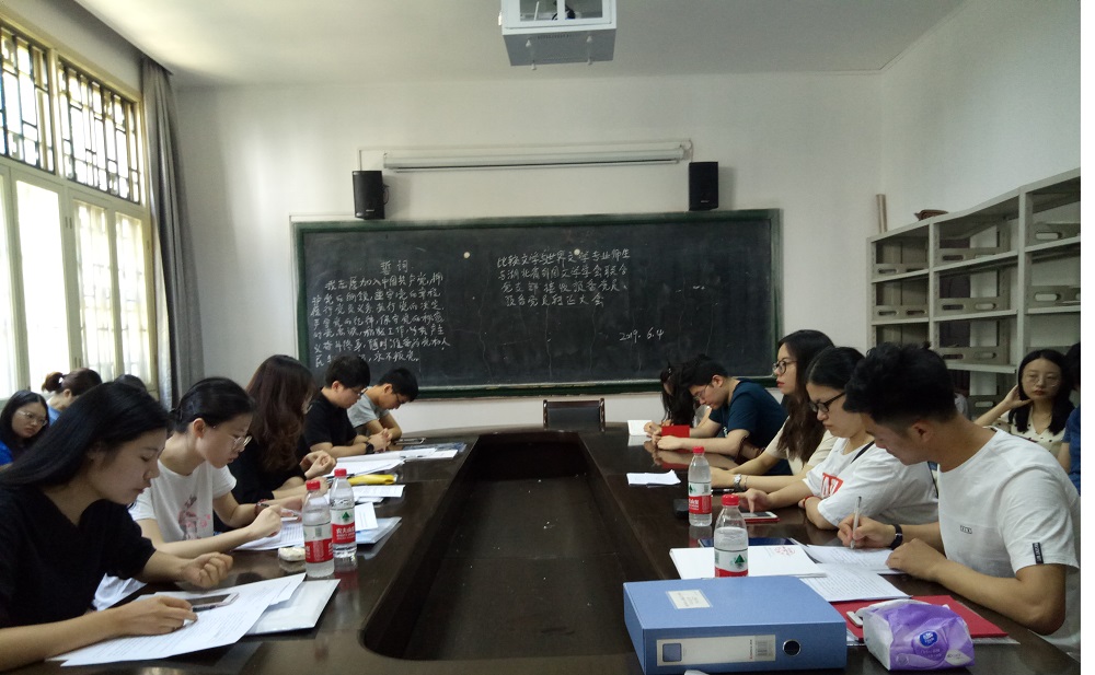 (通讯员:彭颖)2019年6月4日,比较文学与世界文学专业师生与湖北省外国文学学会联合党支部于比较文学与世界文学教研室召开了接收刘枝叶、鲁阳、郑雅坤、朱咪咪同志为预备党员暨预备党员丁萌同志转正的大会。大会由组织委员王磊主持。