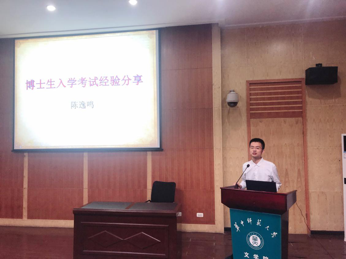 四位优秀准博士生从自身经历出发,对他们的考博经历做了精彩的分享。来自古代文学专业的陈逸鸣毕业去向为厦门大学,他向同学们分享了自己考博的心路历程,指出读博首先要有明确而坚定的目标,不为外物所扰,坚守本心;平时学习要以文献学做基础,文艺学作为文学研究的主体,文化学作为文学研究的外延注重开拓学术视野,构建知识体系;并以自己的笔试面试等经历为例介绍了如何正确选择院校,在考试冲突时如何学会舍取。