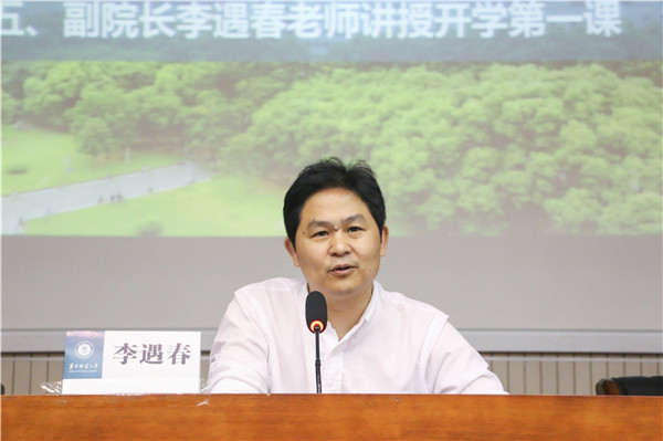 随后,本次活动主讲人、李遇春副院长讲授开学第一课。他以“转变”为主题,从学习中文的共性与特殊性两方面入手,分四点进行讲授。他先从共性出发,指出当代中文系新生应拓展知识结构,转变思维与观念。接着,他又结合新时代中国特色社会主义的时代要求,讲述学习中文的特殊性。他还以习近平总书记的“希望中国文学艺术家能够有所创造”为寄语,勉励当代学子培养文学素养,发出自己的声音,在文化上创造创新