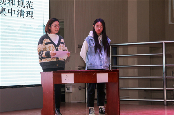 比赛伊始,城市与环境科学学院、文学院、社会学院、教育信息技术学院、新闻传播学院五组代表队依次进行了风采展示介绍。接着比赛正式开始,在轮答题环节中,各队分别派出三位队员依次上场参加单选题、多选题、简答题三轮竞赛,各队选手准备十分充分,比赛分数不相上下。随后进入抢答赛环节,在评委老师刘汉骄的监督下,选手们严格按照规则来举牌抢答,比赛渐渐进入了白热化阶段。来自社会学院的3号选手肖亮成功抢答出中央军委政治工作部组织编辑红色记忆图书是《星火燎原》,领先城市与环境科学学院,晋级成功。本轮比赛后新闻传播学院以58.72分暂居第一,其次是文学院、教育信息技术学院、社会学院,而位居榜尾的城市与环境科学学院则遗憾淘汰。