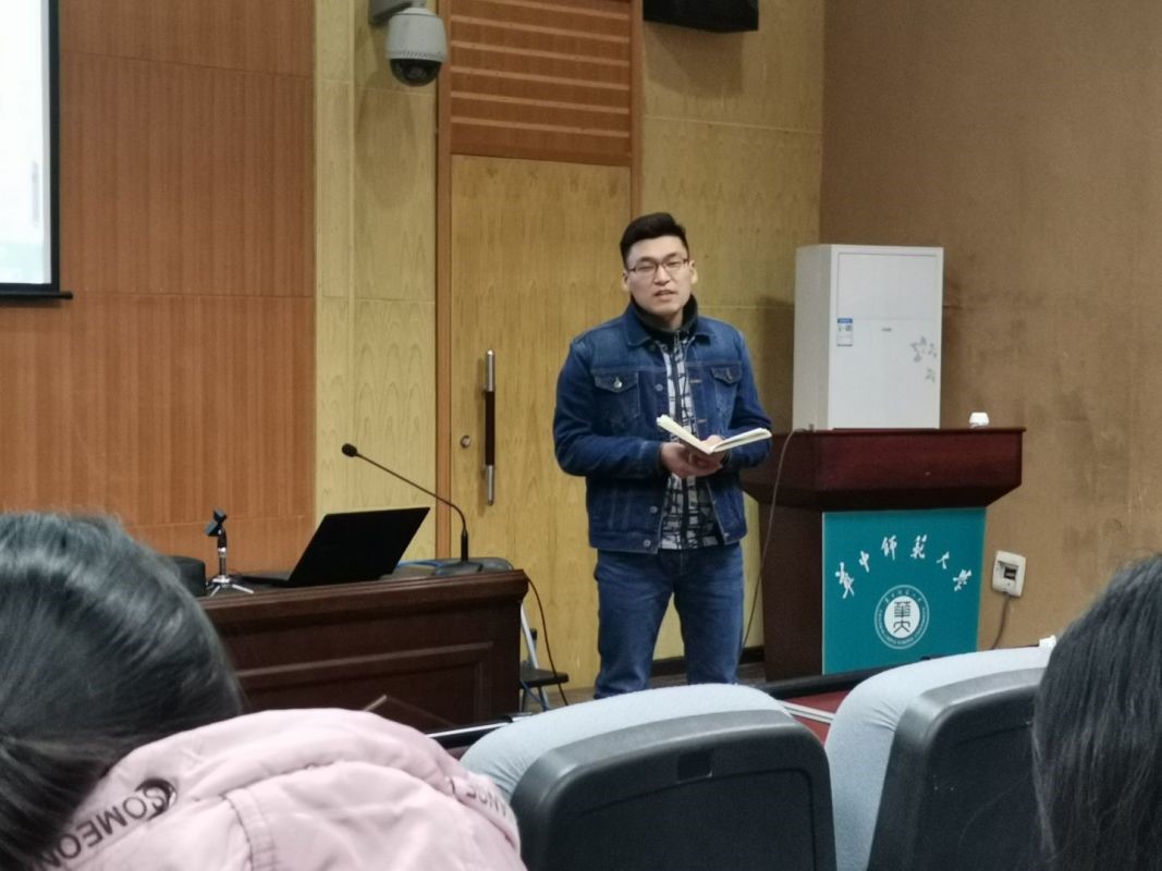 (通讯员 胡雨欣 孙雪格)12月5日晚,文学院2019级基地班第一次“明知”分享会在文学院一楼报告厅举行,本次活动由华中师范大学文学院2019级基地班主办。任洁同学、冯静远同学担任主讲人,班导师王海龙主持。
