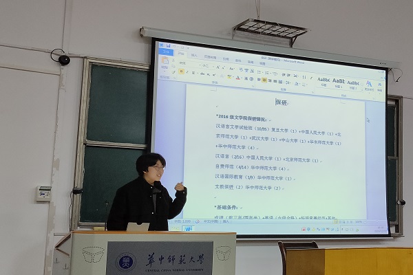 随后,徐梓源学姐针对考研与保研分享了自己的经验体会。首先她以数据的方式展示了2016级各分流专业以及各学校的保研人数,供同学们参考自己的成绩。接着她提到保研的基础条件主要为前三年的成绩、英语成绩(六级必须合格)以及科研竞赛经历。保研的方式主要有五种,分别是六到八月的夏令营、九月初到九月中下旬的预推免、九月推免(九月二十八日至十月中下旬)、九月中旬的支教保研以及校级互推。随后学姐以自己的申请与保研经历为例,讲解了一些具体的注意事项以及各学校的考核方式。选择报考院校时一般考虑学校的综合实力、学科实力、地理位置、与本校的关系、学院往届保研去向等因素。各学校的考核方式也有所不同,一般分为专业笔试和面试,笔试问题基于所报考的专业,要注重基础知识的复习;而面试则是建立在自我介绍基础上,如用中英文谈谈对某作家、流派、概念的理解或是个人的论文框架和科研项目。学姐重点提到除了自己的研究兴趣外,要注意对其他相关方面的了解。同时学姐指出着重要注意的几点:一是首先要拿到本校的保研资格;二在面试过程中保持真诚和诚实,敢于承认自己的不足;三是注意信息的获取,不要错过报考信息;四是提前了解报考专业并准备材料。最后学姐鼓励同学们要把握当下,继续努力,并且找准自我定位,选择最适合自己的一条路,不留遗憾。
