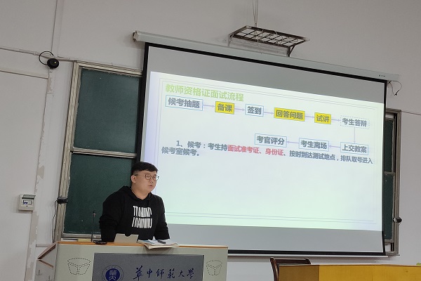 活动伊始,王帅学长以刚刚结束的教资笔试引入,具体从三个方面介绍了教资面试的流程和注意事项。首先他以2018年教资面试真题为例,展示教资面试的整个流程,即候考抽题、备课、签到、回答问题、试讲与答辩,最后上交教案并离开考场。接着他详细介绍和分享各环节的具体要求与建议:一是抽题备课,其准备时间为二十分钟,需完成一份结构完整的教案。他建议要合理分配时间,首先利用三分钟读题,撰写教案紧紧围绕三个基本要求,并包含内容与学情分析、教学目标、教学重难点、教学方法、教学过程(教师活动与学生活动)以及课后检测与板书设计,有条件最好采用表格形式。该项计入面试总分;二是回答规定问题,形式为考官抽题,限时五分钟,问题涉及语文教学方面、教学突发状况、班级管理、时政热点问题等。他强调回答问题时需沉着冷静,展现自己的合理见解,尽量不要死记硬背标准答案;同时必须注意遇到不了解的问题虚心承认,不随意回答;试讲时间为十分钟,建议新课导入一到二分钟,新课进行七到八分钟,复习小结一分钟。他指出试讲一定要围绕给定题目,环节清晰完整;板书一定要写,这是很容易忽略的部分;同时一定要有学生活动和回答问题的有效评价。随后他又强调了一些注意事项,一是知礼节:妆容服饰需要清爽整洁;进场先敲门并问候评委老师,进行自我介绍时不得透露姓名信息;二是重素养:教学设计合理规范、语言使用普通话,语速适中,语调抑扬顿挫;注重仪态,与评委有眼神交流。