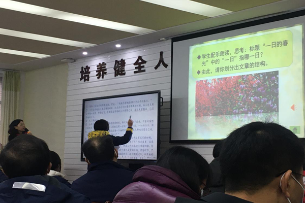 活动伊始,青年教师徐虹进行了冰心《一日的春光》公开课教学与说课展示。她从文章的段落层次划分入手,引导学生在三部分中寻找表达作者感受、思考的语句,梳理行文线索,概括作者从一日春光中获得的人生感悟。其间多采用学生自由讨论、教师下台指导的方式,使学生充分表达自身见解,自主完成对文本的探索。课堂整体气氛活跃,学生发言积极,教师讲解张弛有度。既圆满达成了学习目标,也展现了语文教学应有的美感。