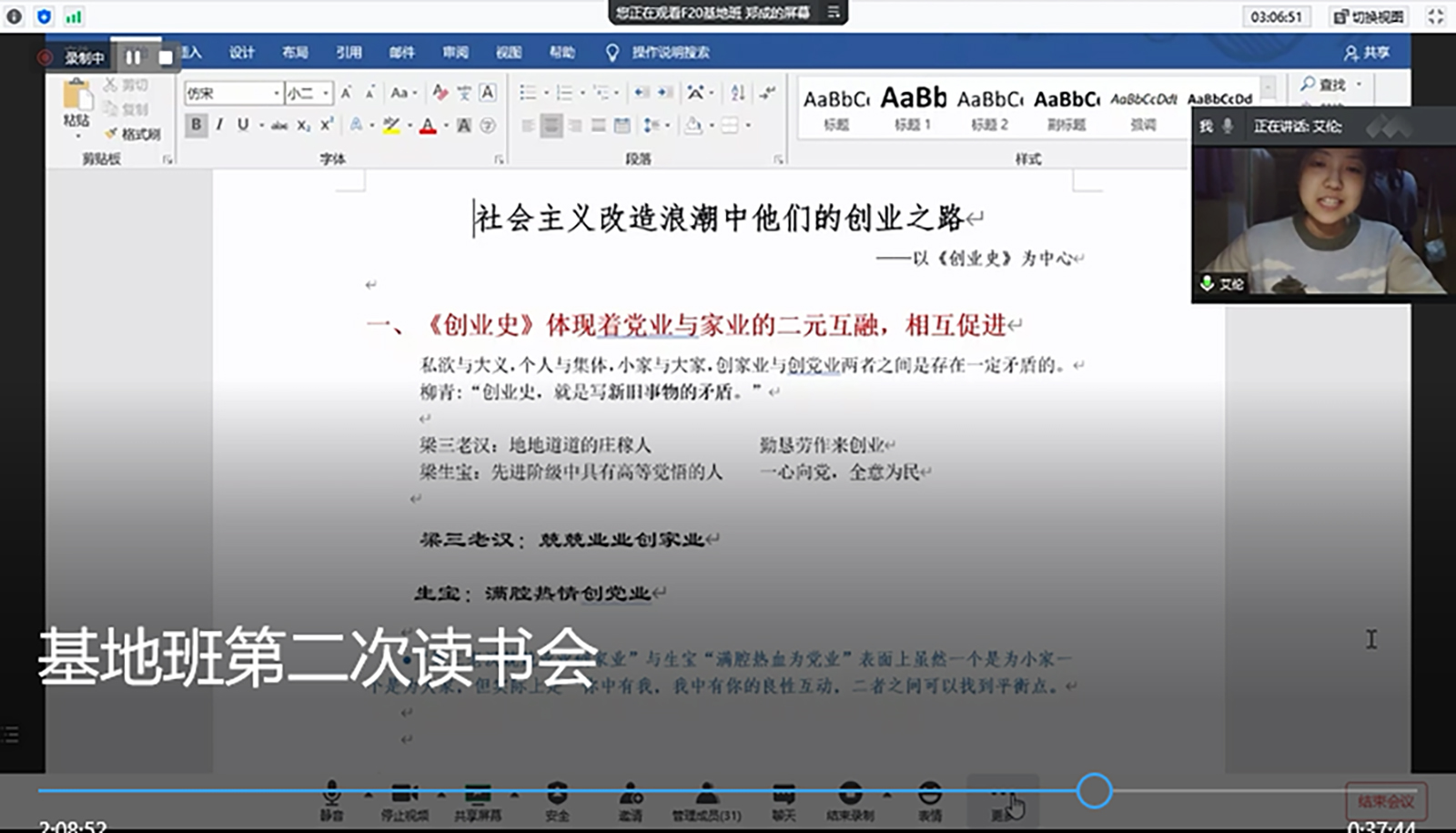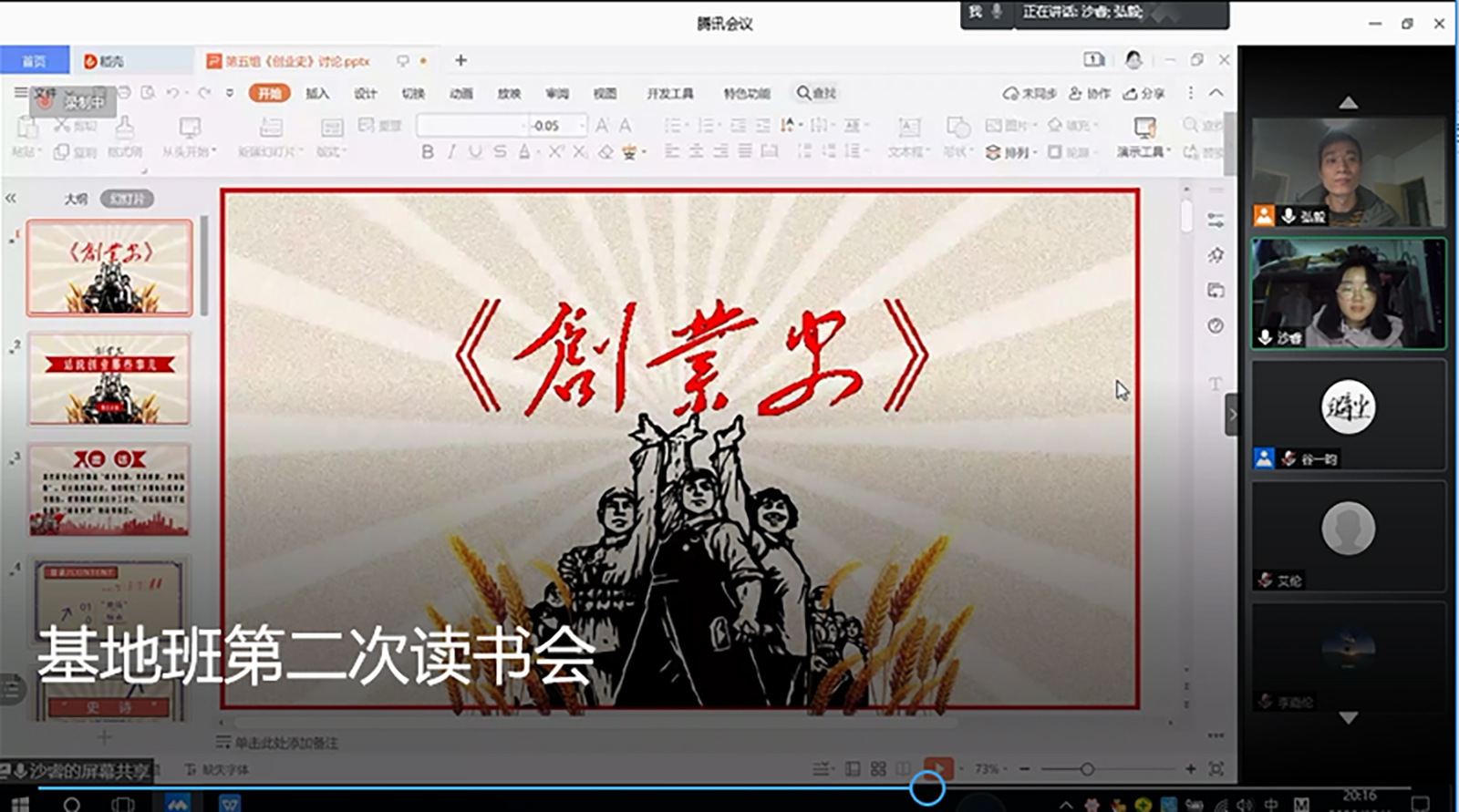 (通讯员 陈泉冰 唐艺卓 魏珍妮 邹欣欣)12月4日晚,文学院20级基地班《创业史》读书研讨会暨第二次团日活动顺利开展。本次活动采用腾讯“云”会议方式开展,20级基地班全体同学参与,石梦浩担任主持人,班主任王仁宝予以总结。