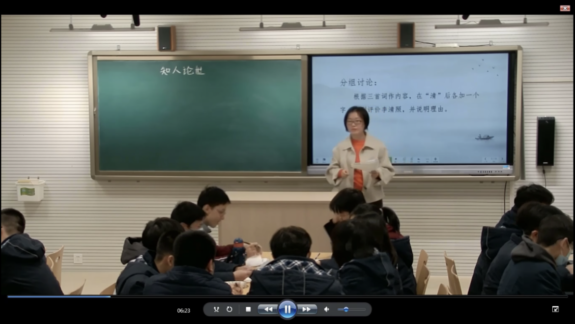 会议首先播放了水果湖高中宋一凡老师的“诗歌鉴赏之知人论世”的公开课视频,宋老师从辛弃疾的《摸鱼儿·更能消几番风雨》诗歌鉴赏题入手,引出“知人论世”的主题,她指出“知人论世”出自《孟子·万章下》:“颂其诗,读其书,不知其人可乎?是以论其世也。”接着她请同学们根据李清照的三首词作内容(《如梦令》,《一剪梅》,《声声慢》)在“清”后各加一个字,经分组讨论,同学们结合诗人的个人经历分别概括出“清欢”、“清思”和“清冷”的诗歌主题。之后宋老师让同学们对杜甫四首不同时期的诗歌按照创作时间先后排序,进而请同学们从个人遭遇和时代际遇两方面总结影响诗歌创作内容的因素。最后,宋老师让同学们进行实战演练,即运用“知人论世”分析《登岳阳楼二首》(其一)中诗人陈与义的情感,学生们结合本节课堂所学,从国家动乱、漂泊之苦、老去之悲三个方面品悟了诗人“无限悲”的感情。