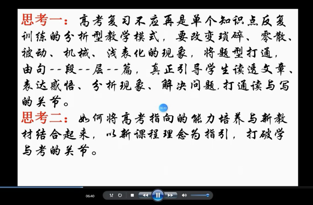 研修会的第二环节,方彦萍老师作了“创设主题教学,贯通‘横越’能力”的报告。方老师指出,2017版的《普通高中语文课程标准》突出了三个特点:以语文核心素养为纲的大单元设计;注重真实语文生活情境中的深度学习;以学生的语文实践为中心的教学过程。因此,高考复习应改变琐碎、零散、被动、机械、浅表化的现象,教师需真正引导学生读透文章,表达感悟,分析现象,解决问题,打破读与写、学与考的关节。在报告中,方老师还分享了“致敬最美劳模”专题活动与“中国精神和文化”探究过程等多个课堂实例具体阐述了她的教学模式探索。方老师强调,教师应当恰当选择单篇教学、群文教学、专题教学、项目学习等不同教学设计方式,由知识传播者转为学生学习活动的设计者和组织者、学习资源及学习策略的提供者和指导者。