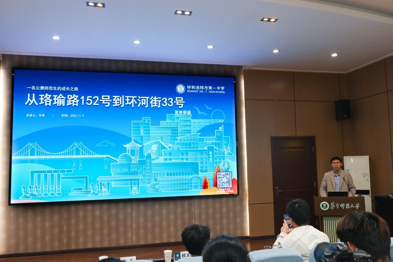 接着牛杰介绍了所在的呼市一中的学校概况、办学情况,以及呼市一中招聘的公费师范生职业发展情况,他结合自身工作经历谈教师专业化发展路径,从听课、改革、创新、担当四个方面阐释教师素养与教育情怀,鼓励同学们发挥特长、积极探索、勇于担当。