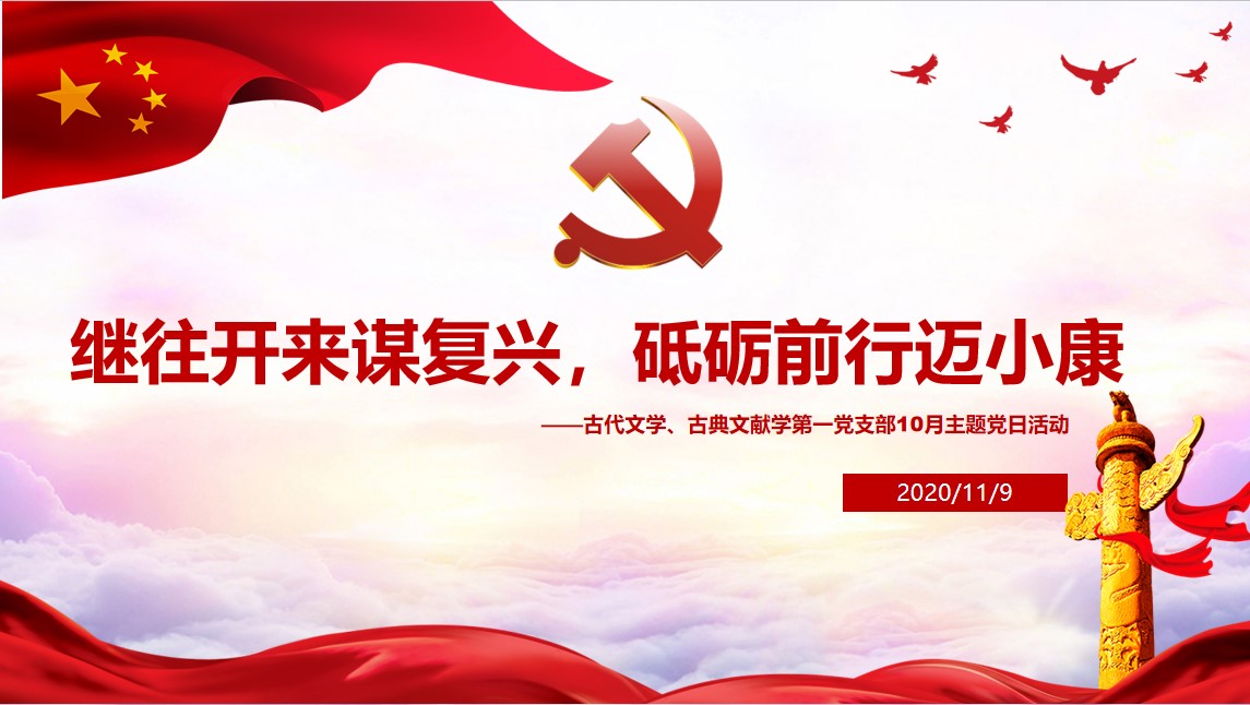 (通讯员:丁亚苹)2020年11月9日晚六点,古代文学、古典文献学第一党支部于在文学院党员活动室组织开展十月份“继往开来谋复兴、砥砺前行迈小康”主题党日活动。此次活动旨在认真领会习近平总书记在纪念抗美援朝战争70周年大会上的讲话精神,深入学习十九届五中全会精神,贯彻落实以习近平新时代中国特色社会主义思想为主要内容的“不忘初心、牢记使命”主题教育。支部书记黎梦雨同志担任主持人,支部党员及入党积极分子参与了此次活动。