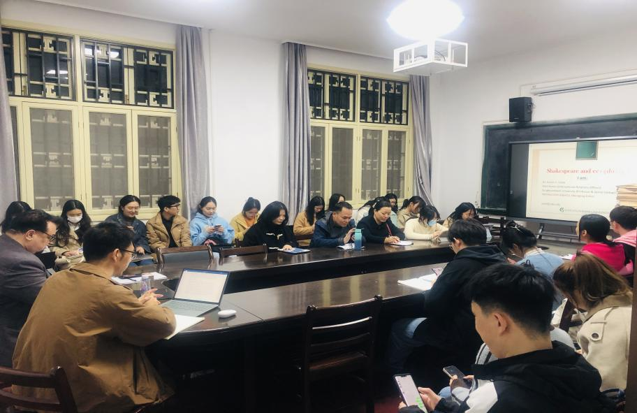 (通讯员 汪希)2023年11月23日晚上,国际知名学者、欧洲科学与艺术学院院士西蒙·埃斯托克教授应邀做客桂子山人文论坛,在文学院一楼外国文学教研室带来了主题为“莎士比亚与生态恐惧”的学术讲座。本次讲座由华中师范大学文学院谢超副教授主持,本学科与外国语学院硕博研究生参加了此次学术交流活动。