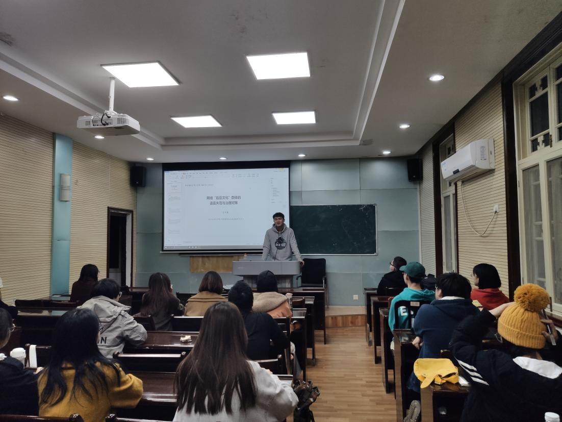 (通讯员 苏琬童)11月12日晚,第二期桂子山语言文化沙龙于文学院317会议室举行。此次沙龙特别邀请武汉大学文学院王宇波副教授作客讲授,由华中师范大学文学院陆方喆副教授主持,围绕“网络‘后亚文化’群体语言失范现象与治理对策”这一主题,针对网络语言不文明现象进行了深入阐释。文学院部分2018、2019级语言学专业本科生到场聆听讲座,现场气氛活跃。
