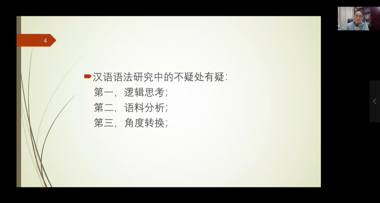 周教授以胡适先生“做学问应不疑处有疑,待人要在有疑处不疑”切入,分三部分内容,以对兼类词处理的反思为例,强调了逻辑思考的重要性;以汉语经典表述“客人来了”为例,向同学们展示语料分析对“寻疑”的帮助;以“一锅饭吃十个人”这个句子为例,带领同学们从供用句转向功用句,转换角度进行思考。