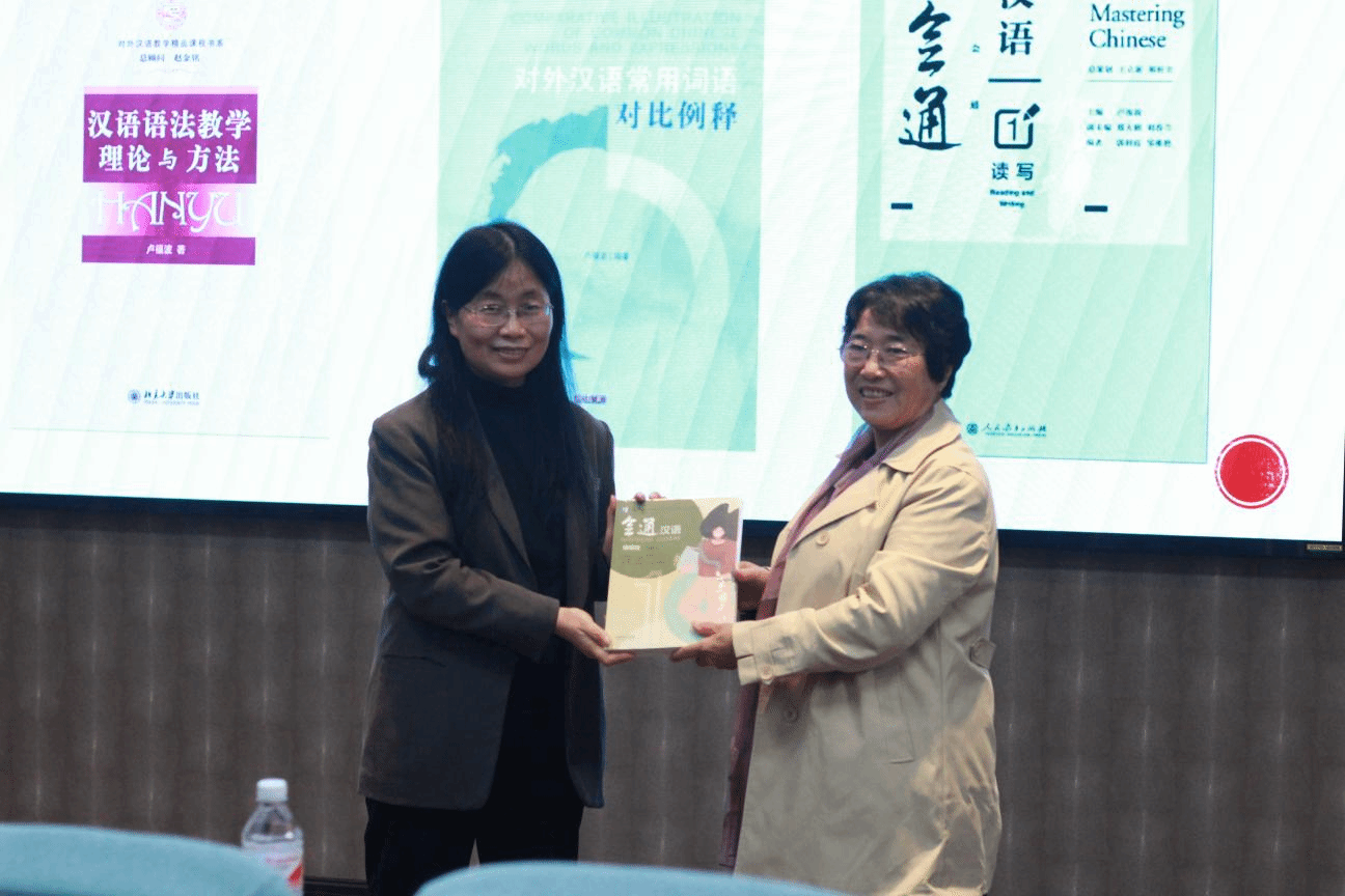 讲座开始之前,卢福波教授将其主编的一套对外汉语教材《会通汉语(精编版)》赠予我院,王洪涌副院长代表学院接受了赠书。