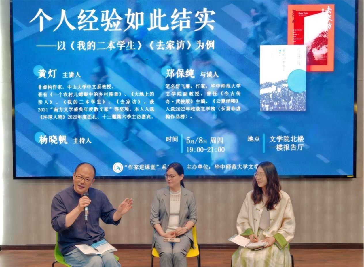 文学院讯(通讯员 汪昕菲)5月8日晚,著名非虚构作家、中山大学中文系教授黄灯在文学院一楼报告厅为华师学子带来题为《个人经验如此结实——以<我的二本学生><去家访>为例》的精彩讲座。本场讲座由杨晓帆老师主持,郑保纯老师与谈,现当代文学教研室严辉、窦金龙、王仁宝、黄馨怡老师出席,近百名同学到场聆听。
